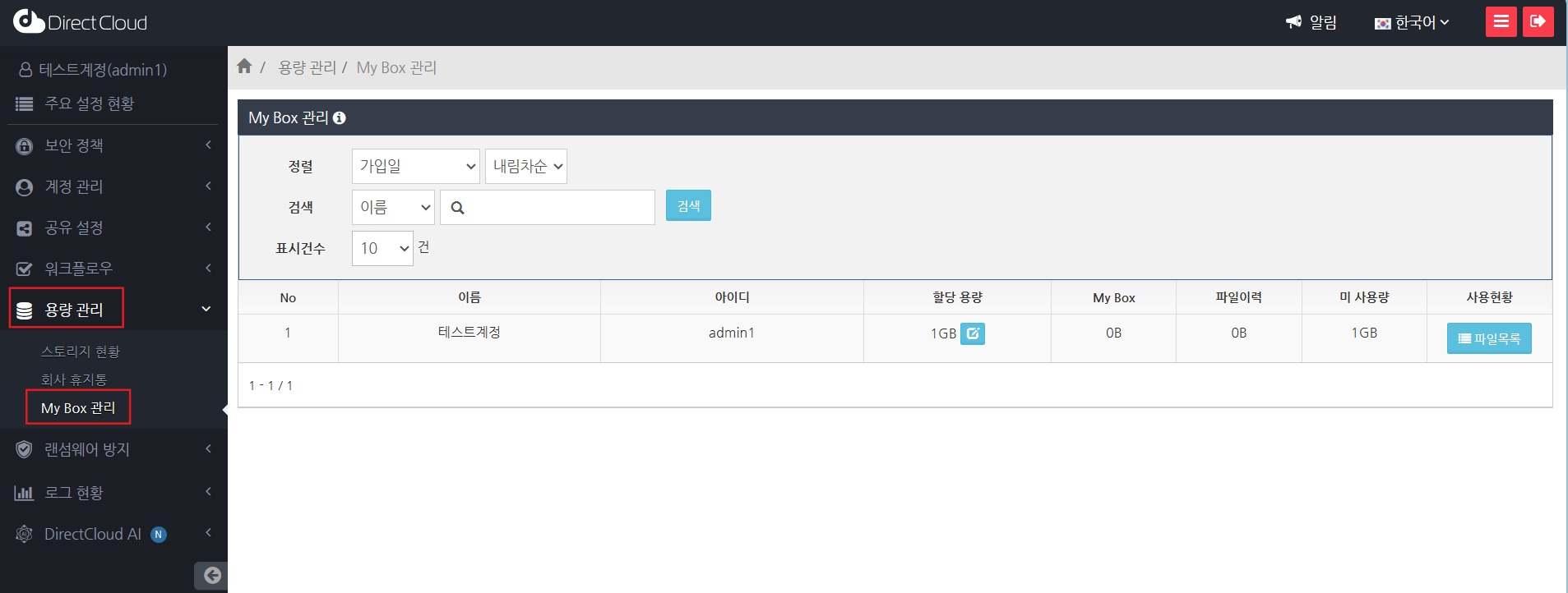 '용량 관리' > 'My Box' 관리 메뉴를 클릭합니다.