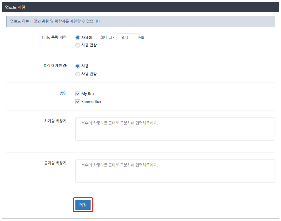 확장자 및 파일 크기 제한을 적용하기 위해 "My Box", "Shared Box"를 선택할 수 있습니다.