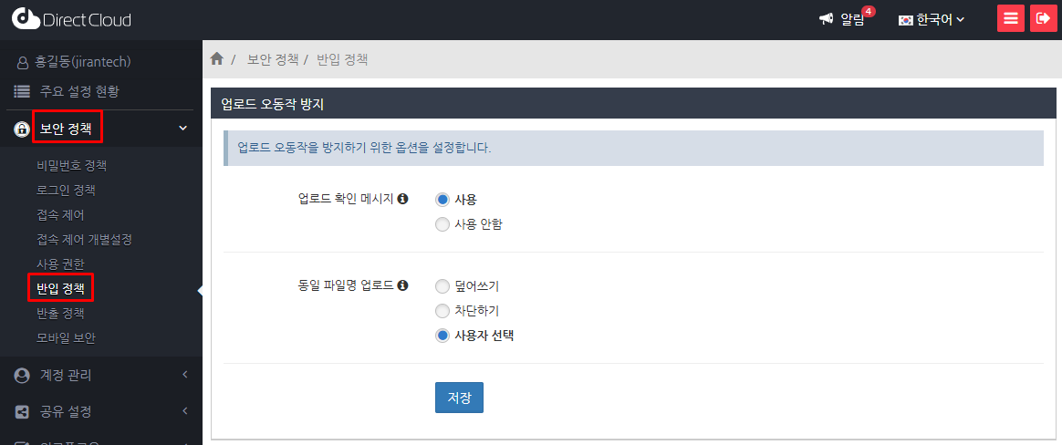 이 매뉴얼에서는 '보안 정책' > '반입 정책' 메뉴의 업로드 제한 설정에서 업로드 가능한 파일을 확장자로 제한하는 방법에 대해 설명합니다.