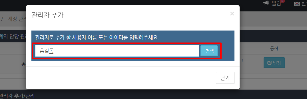‘관리자’ 메뉴는 ‘계약 담당 관리자’ 권한을 가진 사용자 외에는 표시되지 않습니다.