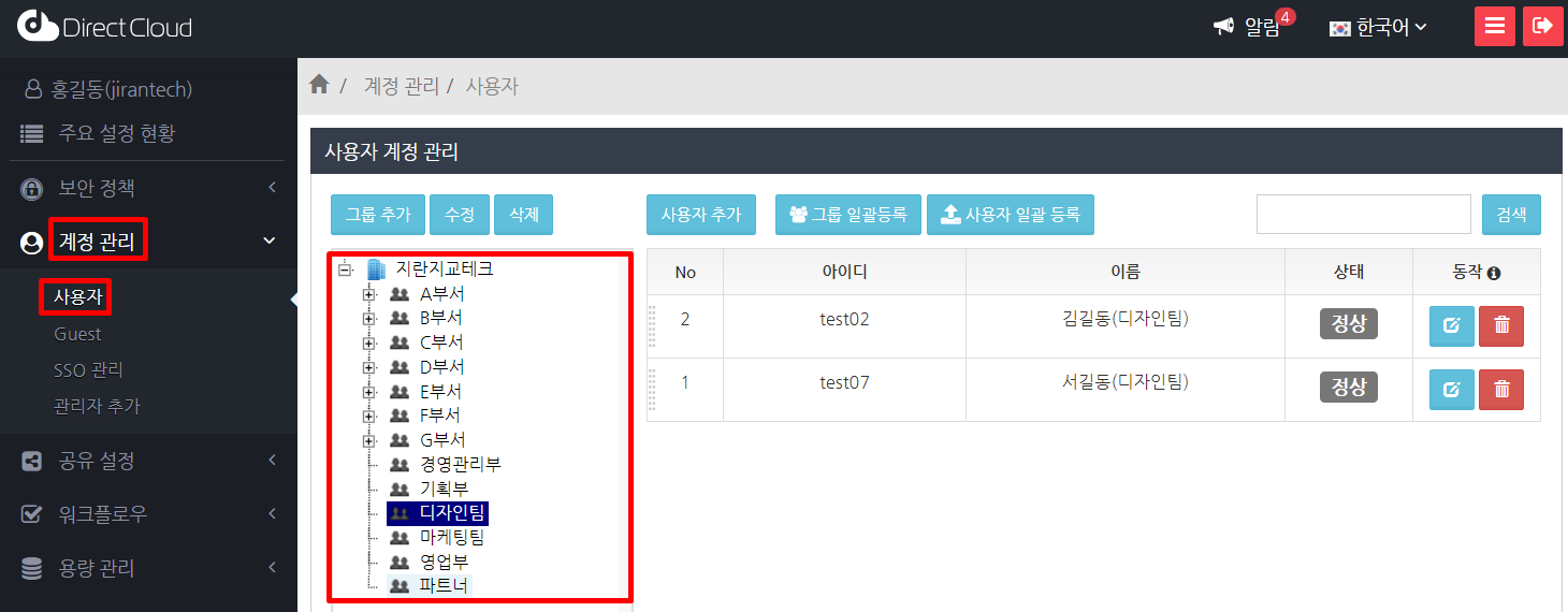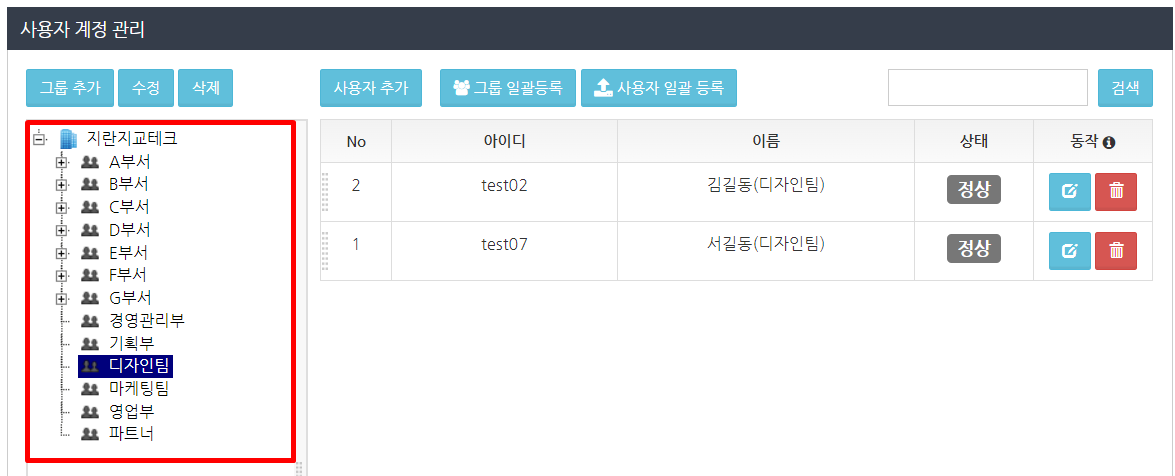 ‘계정 관리’ 메뉴의 그룹은 상·하위 관계를 가진 트리 구조로 표시되지만, 사용자를 추가할 때는 각 그룹을 서로 독립된 그룹으로 취급해야 합니다.