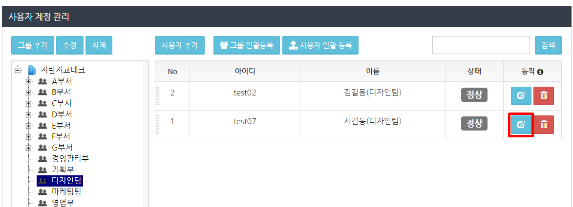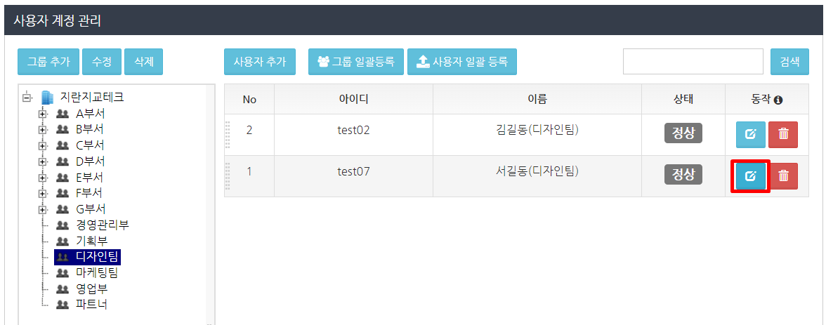 계정 관리 > 사용자 메뉴를 선택하고 편집할 사용자 그룹을 클릭합니다.