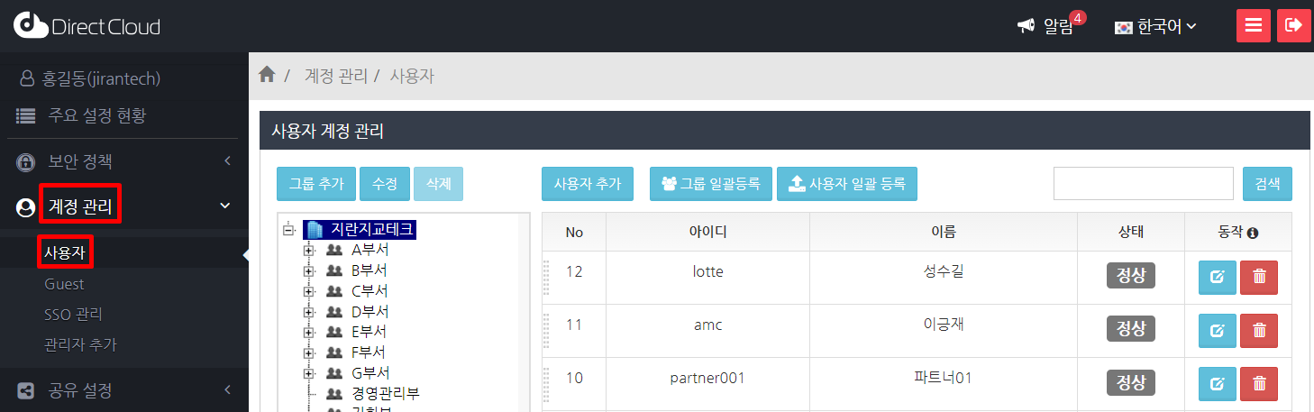 '계정 관리' > '사용자' 메뉴를 선택합니다.