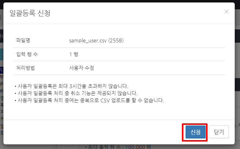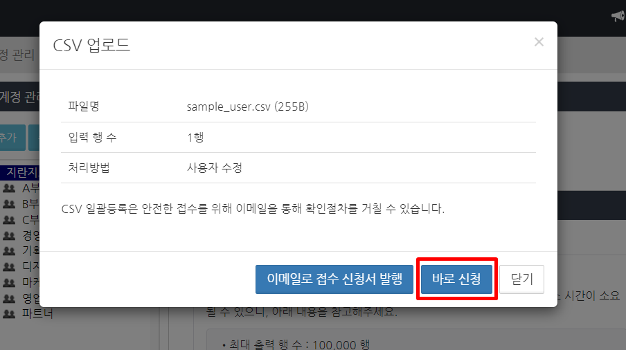 CSV 업로드 확인 화면에서 파일명, 입력 행 수, 처리방법을 확인한 후 바로신청 버튼을 클릭합니다. '이메일로 접수 신청서 발행' 버튼을 클릭한 경우 이 매뉴얼의 절차 중 <사용자 정보 변경 최종 신청 제출>에서 최종 신청을 제출하고 사용자를 업로드 합니다.