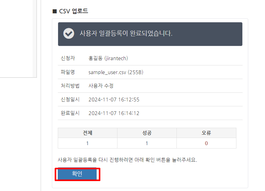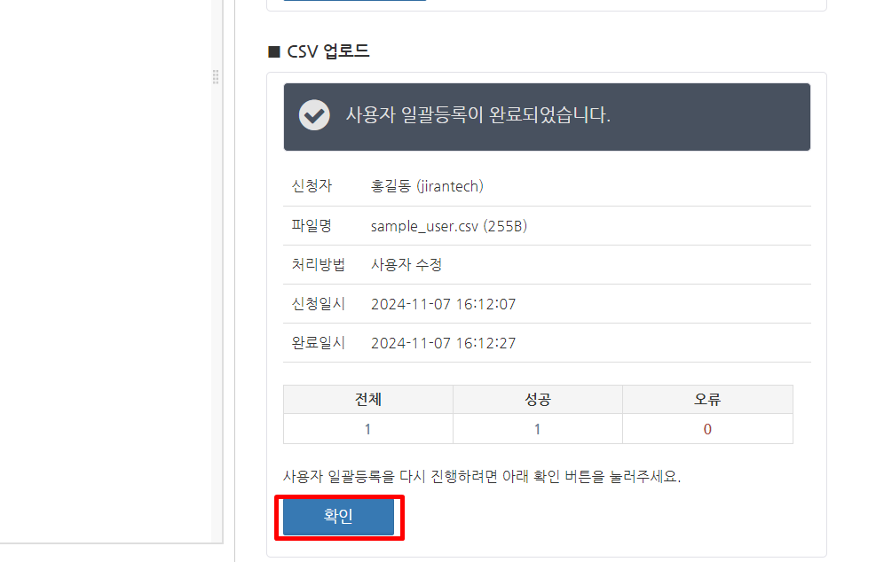 CSV 파일에 작성한 사용자 정보가 변경됩니다. 변경이 완료되면 "사용자 일괄등록이 완료되었습니다."라는 화면이 표시됩니다. 오류가 없는지 확인하고 확인 버튼을 클릭합니다.