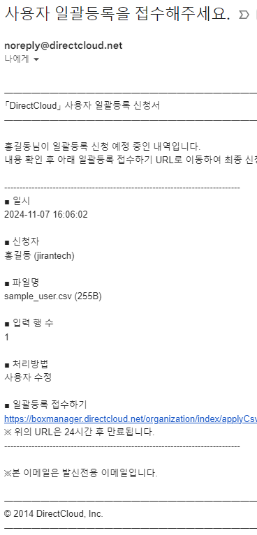 사용자 정보 변경용 CSV 파일 업로드에서 '이메일로 접수 신청서 발행'을 선택한 경우, 신청을 한 계약 관리자 또는 일반 관리자의 이메일 주소로 최종 신청 링크가 포함된 알림 메일이 도착합니다. 다음 단계에 따라 최종 신청을 제출하고 사용자 정보를 변경합니다.