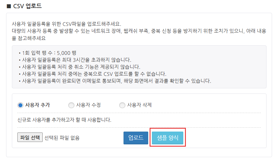 사용자 일괄 등록 화면의 'CSV 업로드' 설정에서 '샘플 양식'버튼을 클릭합니다. 사용자 정보의 일괄 변경에 사용할 CSV 파일 템플릿이 다운로드됩니다.