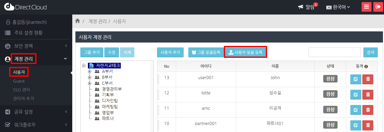 '계정 관리' > '사용자' 메뉴를 선택하고 '사용자 일괄 등록' 버튼을 클릭합니다.