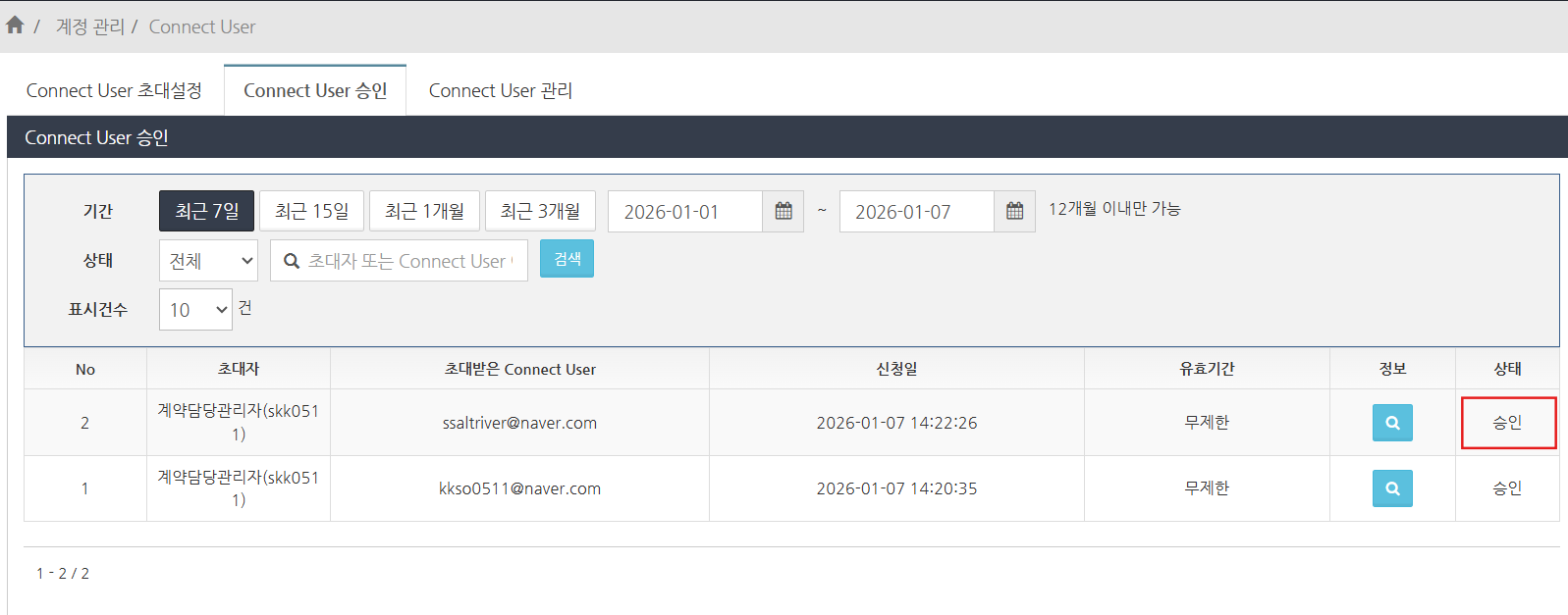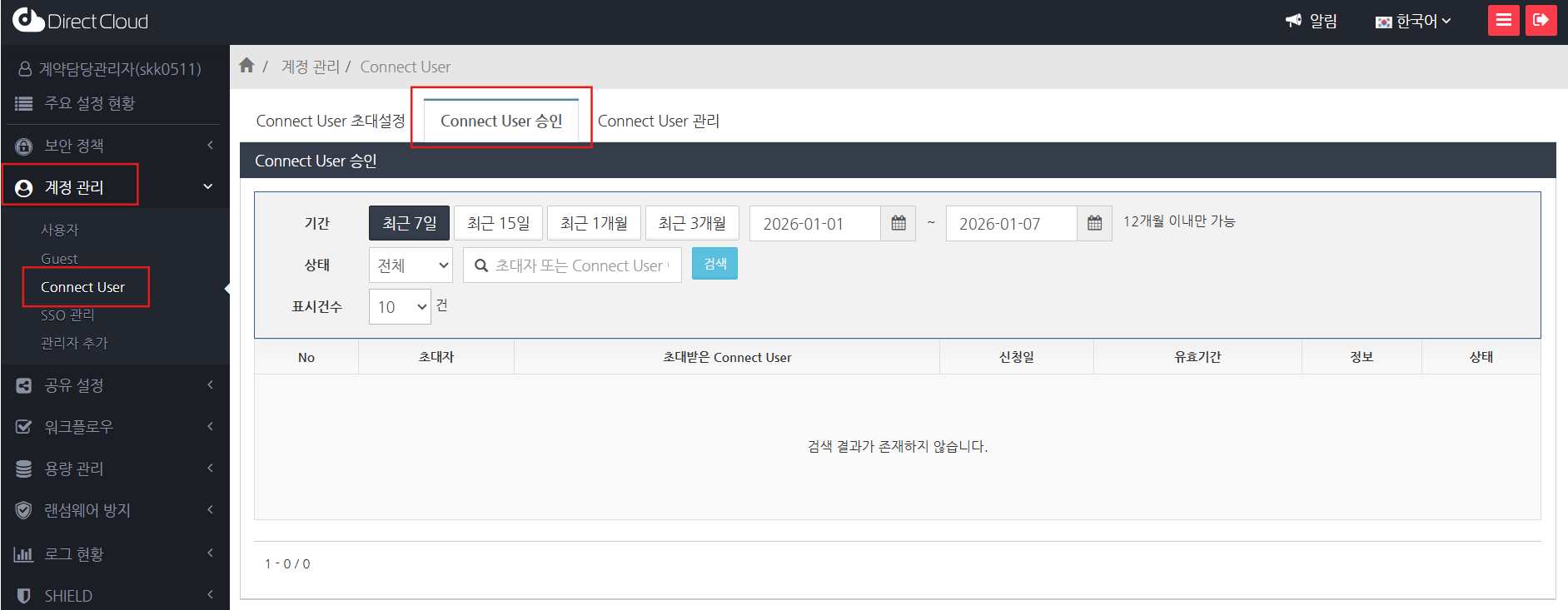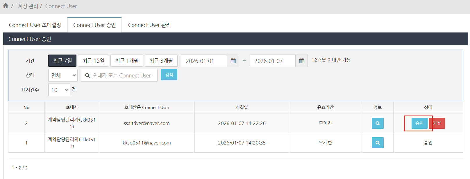 ‘계정 관리’ > ‘Connect User’ 메뉴를 선택한 후, ‘Connect User 승인’ 탭을 클릭합니다.