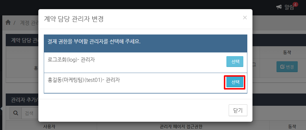 계약 담당 관리자의 권한을 위임하려는 일반 관리자의 선택 버튼을 클릭합니다.