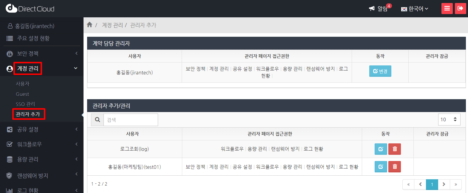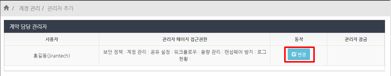 로그인할때 계약담당자였던 계정은 이제 일반관리자로 바뀌게되어어 '계정 관리' > '관리자 추가' 메뉴가 사라지고, 계약담당자 항목에서 사라지게 됩니다.