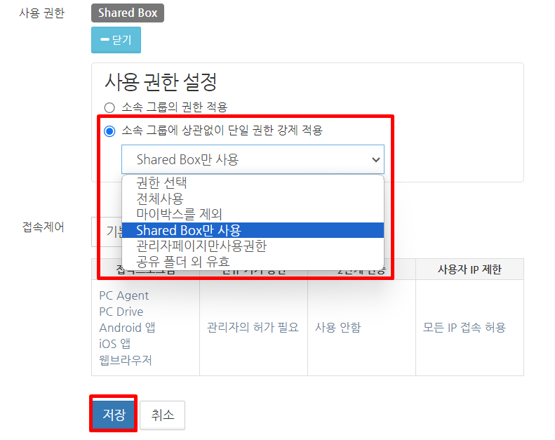예를 들어, 아래와 같이 설정되어 있는 경우에는 사용자에게 모든 권한이 적용됩니다. 예: A권한(My Box만), B권한(링크만), C권한(파일첨부 메일발송만), D권한(업로드 요청만), E권한(Shared Box만)에 소속된 경우