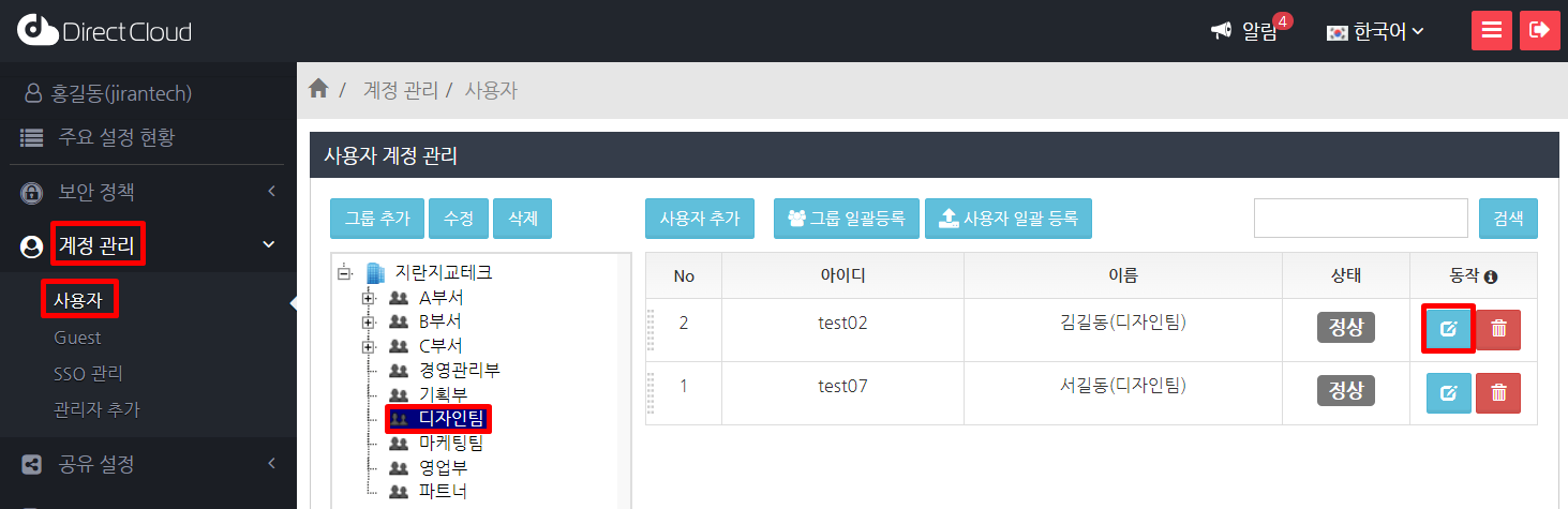 '계정 관리' > '사용자' 메뉴를 선택하고 그룹을 선택한 다음 기능 제한을 변경하려는 사용자의 편집 버튼을 클릭합니다.