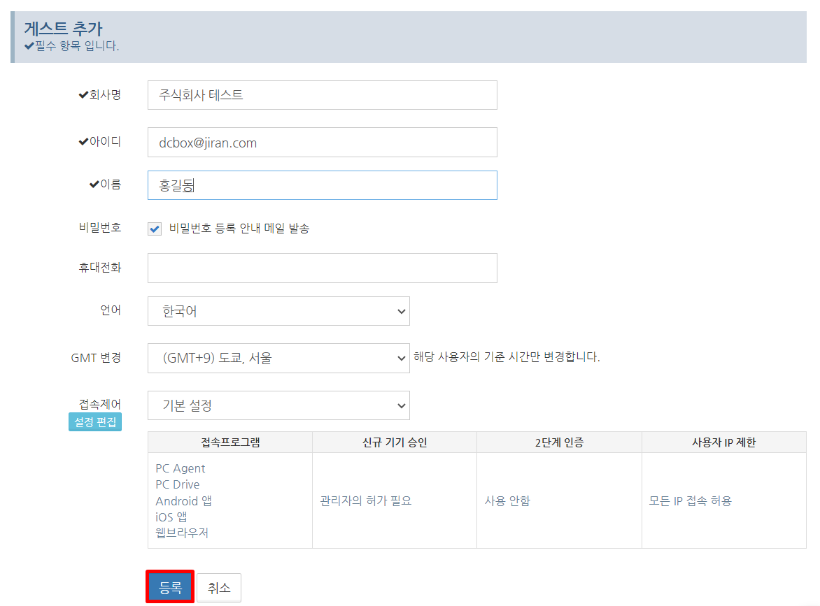 "비밀번호 등록 이메일 보내기"를 체크하고 "등록" 버튼을 클릭하면 패스워드 등록 이메일이 Guest 사용자 ID로 설정된 이메일 주소로 전송됩니다.