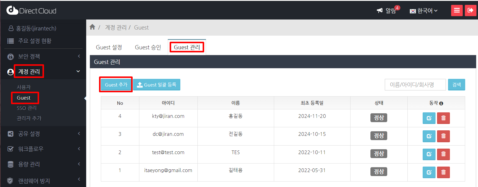 사용자가 Guest를 초대하는 방식 외에도 관리자가 직접 Guest를 추가할 수 있습니다. 이 매뉴얼에서는 관리 페이지의 '계정 관리 '메뉴에서 Guest를 직접추가하는 방법을 설명합니다.
