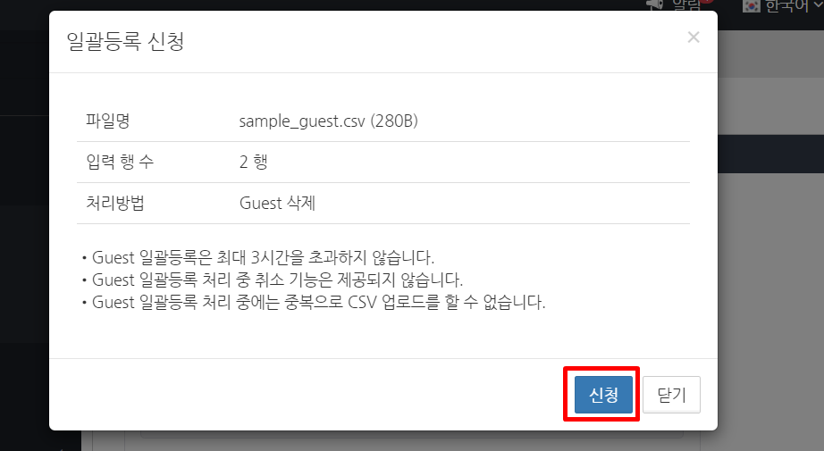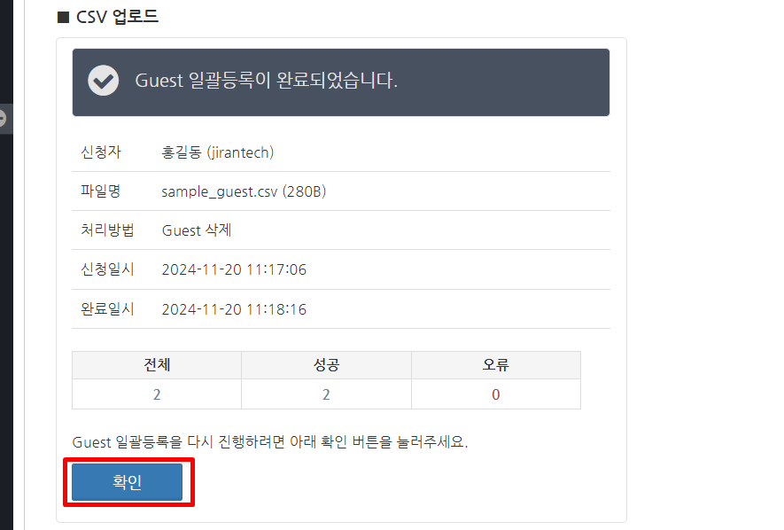 CSV 파일이 업로드되며, 파일에 기재된 Guest가 삭제됩니다. Guest 삭제가 완료되면 "Guest 일괄등록이 완료되었습니다."라는 화면이 표시됩니다. 오류가 없는지 확인하고 확인 버튼을 클릭합니다.