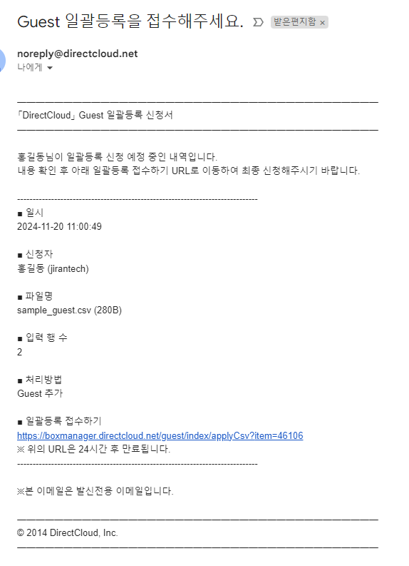 Guest 삭제용 CSV 파일 업로드에서 ‘이메일로 접수 신청서 발행’을 선택한 경우에는, 업로드 요청을 생성한 계약 담당 관리자 또는 일반 관리자의 이메일 주소로 최종 신청용 링크가 포함된 안내 메일이 발송됩니다. 아래 절차에 따라 최종 신청을 전송하고 Guest를 삭제해 주시기 바랍니다.