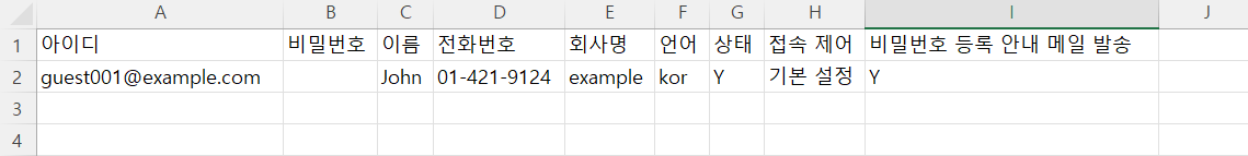 Guest를 삭제하려면, 이미 등록되어 있는 사용자 ID를 입력한 CSV 파일을 업로드해 주시기 바랍니다. 사용자 ID가 일치하는 Guest는 다른 항목의 설정 내용이 일치하지 않더라도 삭제됩니다.