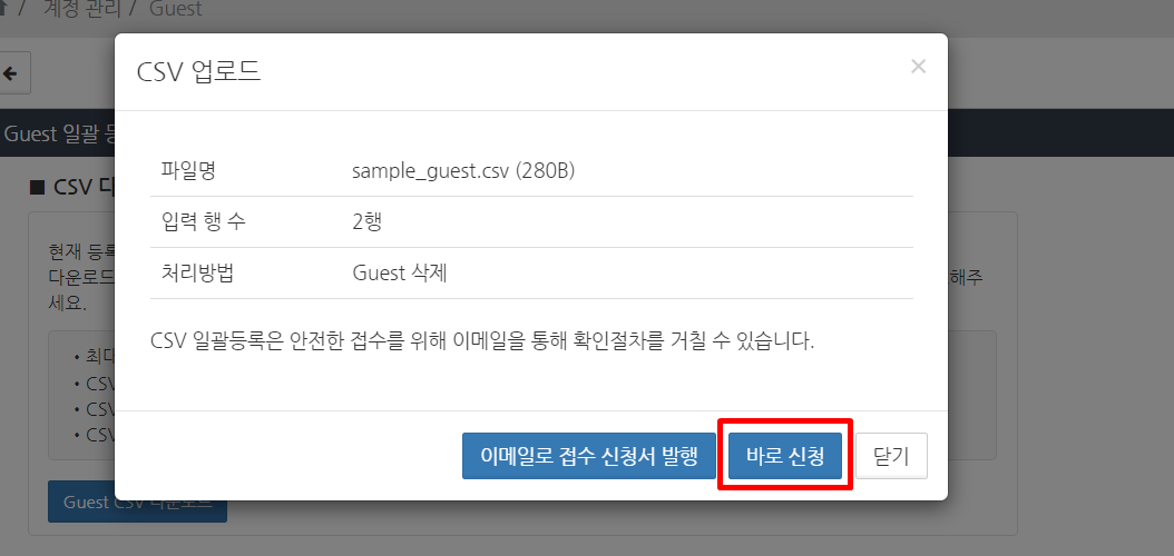 CSV 업로드 확인 화면에서 ‘파일명’, ‘등록 행 수’, ‘처리 유형’을 확인한 후 ‘바로 신청’ 버튼을 클릭합니다.