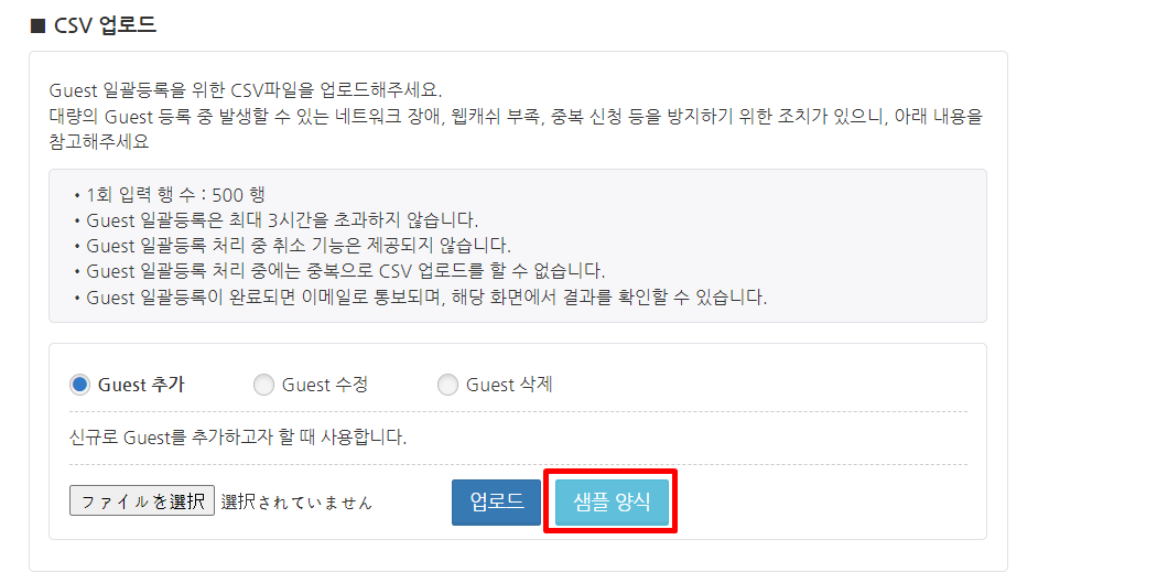 'Guest 일괄 등록' 화면의 'CSV 업로드' 설정에서 샘플 양식 버튼을 클릭합니다. CSV 파일 템플릿이 다운로드됩니다.