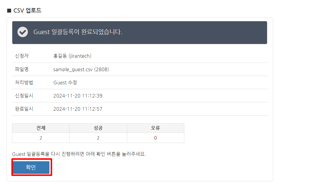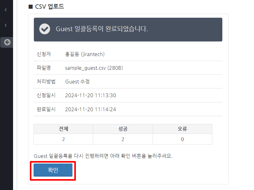CSV 파일이 업로드되며, 파일에 기재된 Guest 정보가 변경됩니다. Guest 정보 변경이 완료되면 "Guest 일괄등록이 완료되었습니다."라는 화면이 표시됩니다. 오류가 없는지 확인하고 확인 버튼을 클릭합니다.
