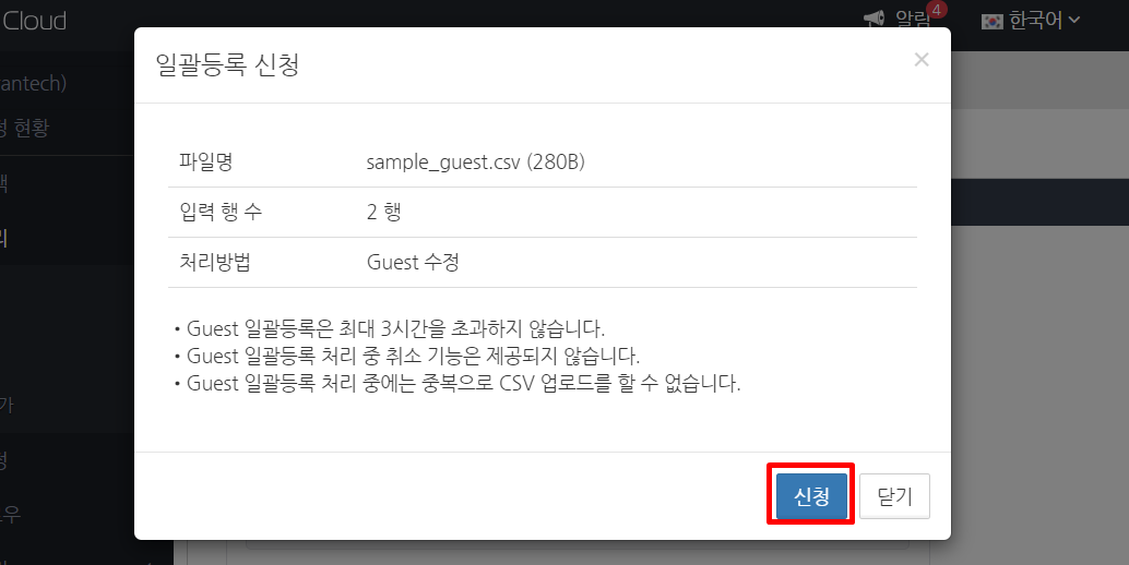 CSV 파일에 기재된 Guest 정보가 변경됩니다. Guest 정보 변경이 완료되면 "Guest 일괄등록이 완료되었습니다."라는 화면이 표시됩니다. 오류가 없는지 확인하고 확인 버튼을 클릭합니다.