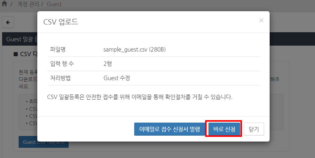 CSV 업로드 확인 화면에서 ‘파일명’, ‘등록 행 수’, ‘처리 유형’을 확인한 후 ‘바로 신청’ 버튼을 클릭합니다.