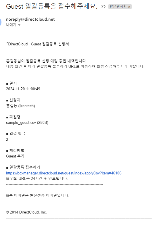 Guest 수정용 CSV 파일 업로드에서 ‘이메일로 접수 신청서 발행’을 선택한 경우에는, 업로드 요청을 생성한 계약 담당 관리자 또는 일반 관리자의 이메일 주소로 최종 신청용 링크가 포함된 안내 메일이 발송됩니다. 아래 절차에 따라 최종 신청을 전송하고 Guest정보를 변경해 주시기 바랍니다.