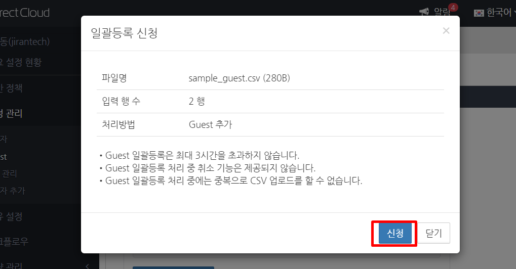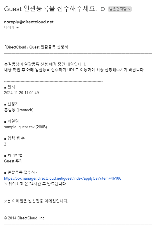 Guest 추가용 CSV 파일 업로드에서 ‘이메일로 접수 신청서 발행’을 선택한 경우에는, 업로드 요청을 생성한 계약 담당 관리자 또는 일반 관리자의 이메일 주소로 최종 신청용 링크가 포함된 안내 메일이 발송됩니다. 아래 절차에 따라 최종 신청을 전송하고 Guest를 추가해 주시기 바랍니다.