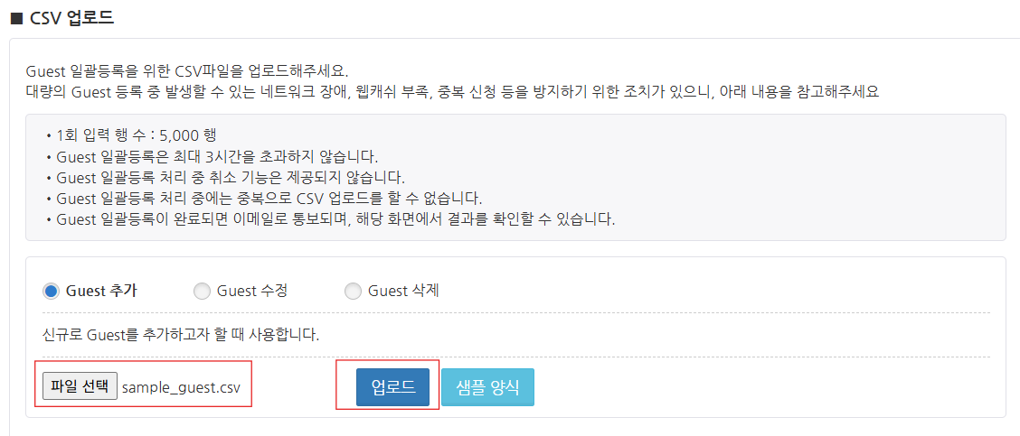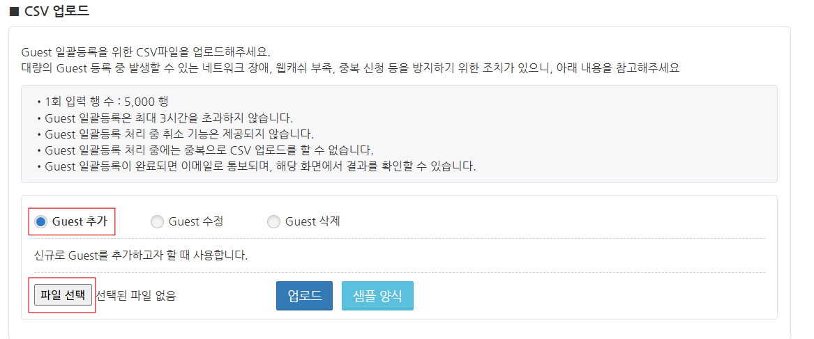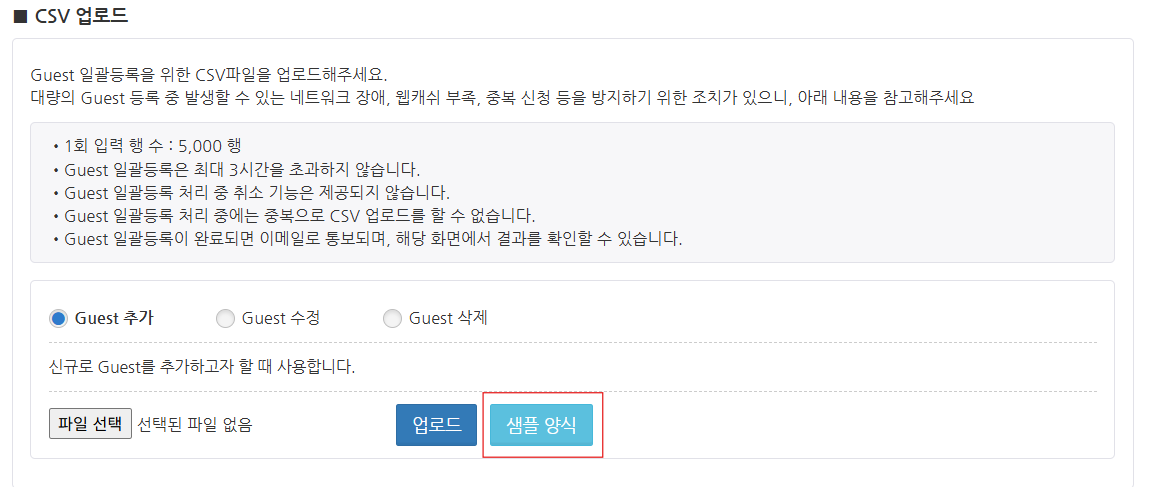 Guest 일괄 등록 화면의 'CSV 업로드' 설정에서 샘플 양식 버튼을 클릭합니다. CSV 파일 템플릿이 다운로드됩니다.