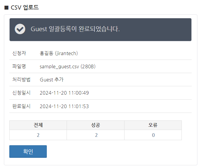 CSV 파일이 업로드되며, 파일에 기재된 Guest가 추가됩니다. Guest 추가가 완료되면 "Guest 일괄등록이 완료되었습니다."라는 화면이 표시됩니다. 오류가 없는지 확인하고 확인 버튼을 클릭합니다.