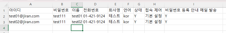 비밀번호 등록 이메일을 보낼지 여부를 설정합니다. 「Y」를 입력하면 패스워드 등록용 메일을 송신합니다. "N" 또는 입력하지 않은 경우 비밀번호 등록 이메일이 전송되지 않습니다.