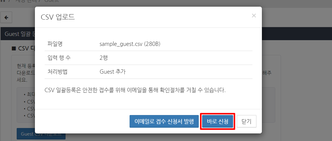 CSV 업로드 확인 화면에서 ‘파일명’, ‘등록 행 수’, ‘처리 유형’을 확인한 후 ‘바로 신청’ 버튼을 클릭합니다.