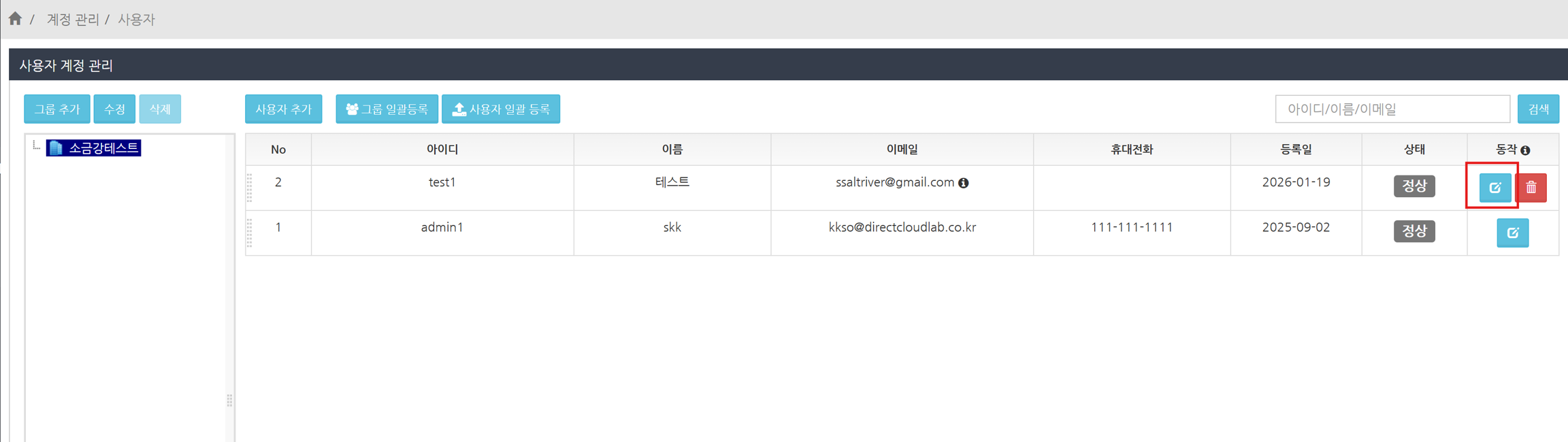 '계정 관리'에서 메일 주소를 활성화하려는 사용자의 편집 버튼을 클릭합니다.