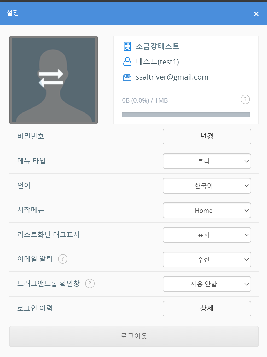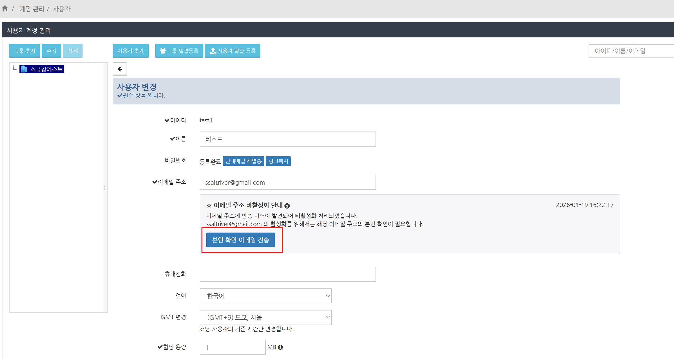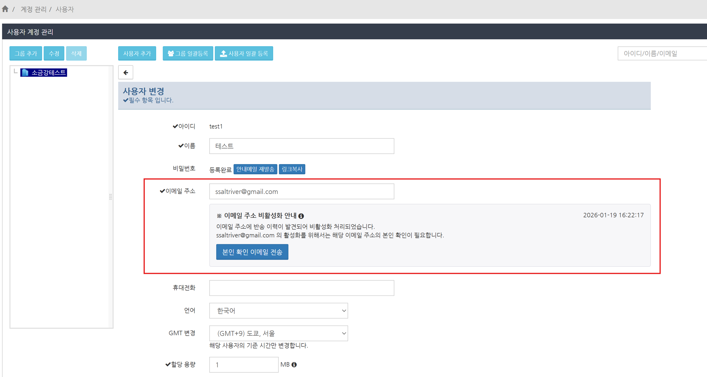 '사용자 변경' 화면이 표시됩니다. 이메일 주소가 비활성화된 경우, 메일 주소 아래에 '이메일 주소 비활성화 안내' 항목이 표시됩니다.