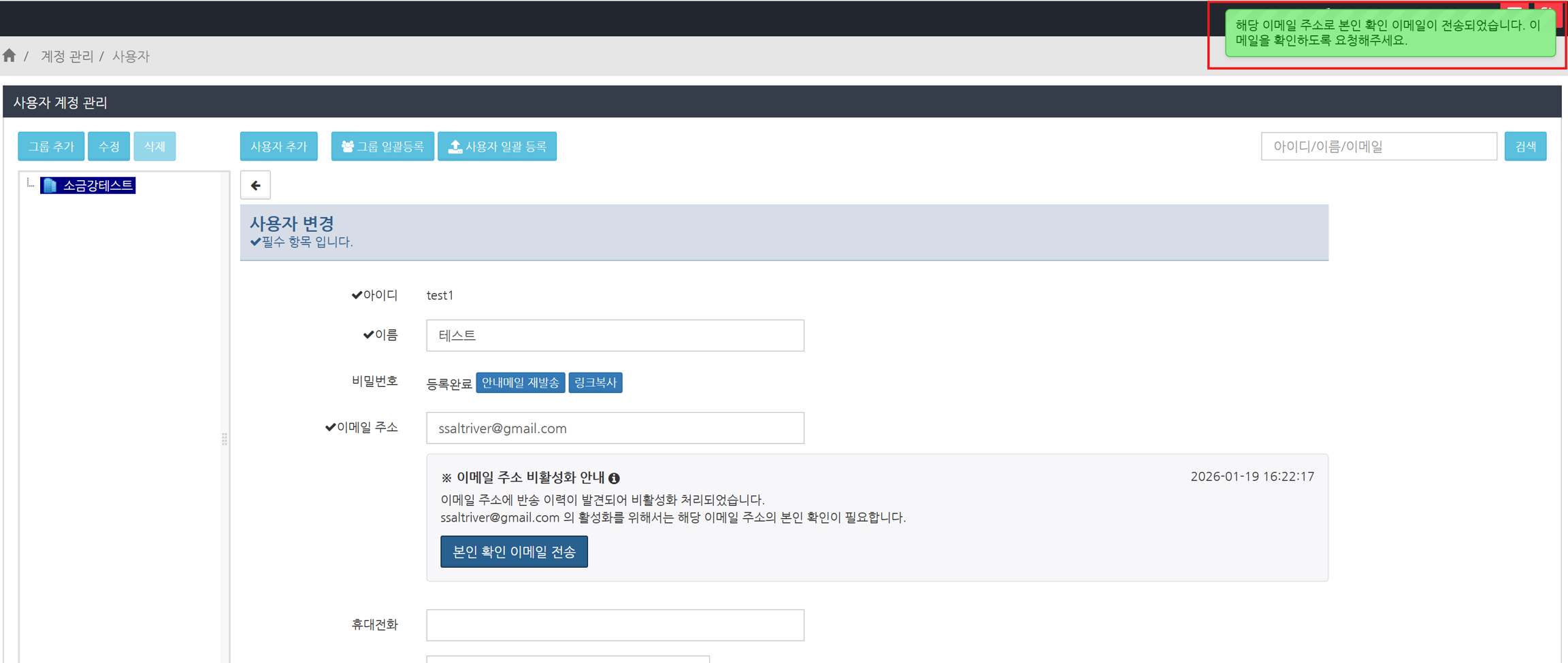 사용자에게 본인 확인용 메일이 발송됩니다.
