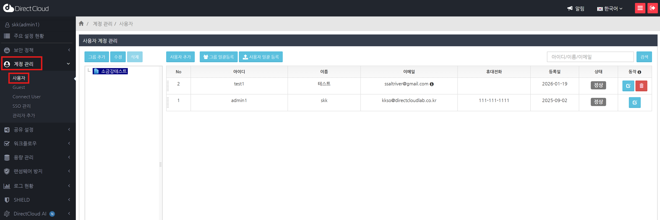 관리자 권한이 부여된 사용자는 관리자 페이지의 '계정 관리'를 사용할 수 있습니다.