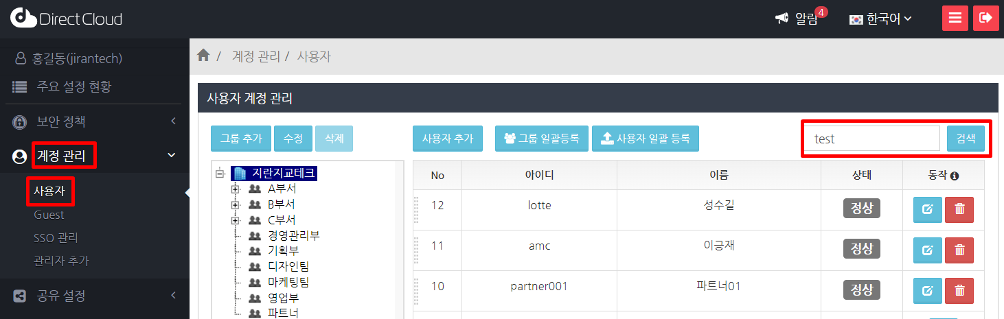 '계정 관리' > '사용자' 메뉴를 선택하고 오른쪽 상단에 표시된 검색창에 검색 키워드를 입력한 다음 검색 버튼을 클릭합니다.