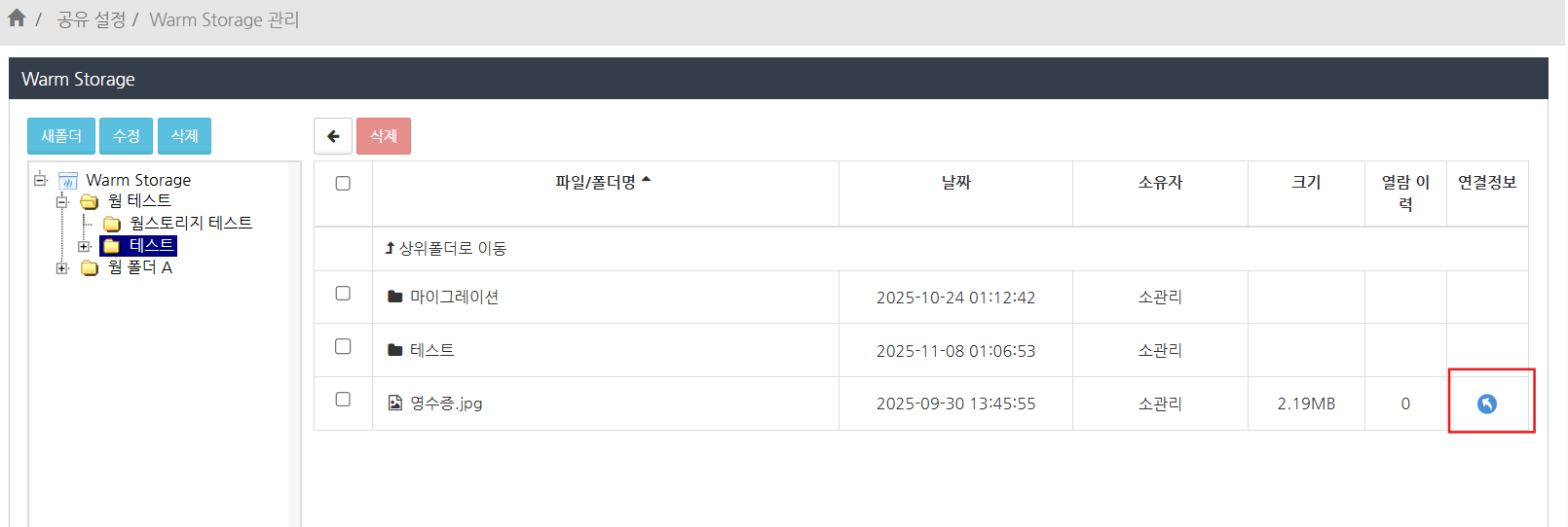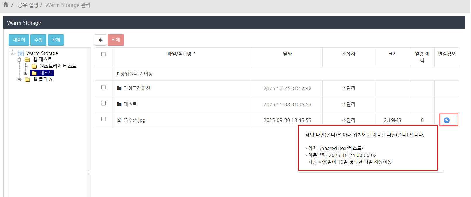 선택한 폴더에 저장된 폴더와 파일이 목록에 표시됩니다. Shared Box에서 Warm Storage로 이동된 폴더 및 파일에는 '연결 정보' 항목에 아이콘이 표시됩니다.