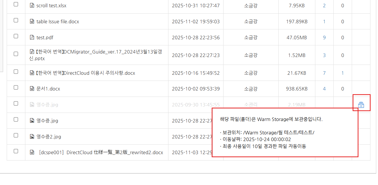 선택한 폴더에 저장된 폴더와 파일이 목록으로 표시됩니다. Warm Storage로 이동된 폴더와 파일에는 저장 위치 정보 항목에 아이콘이 표시됩니다.