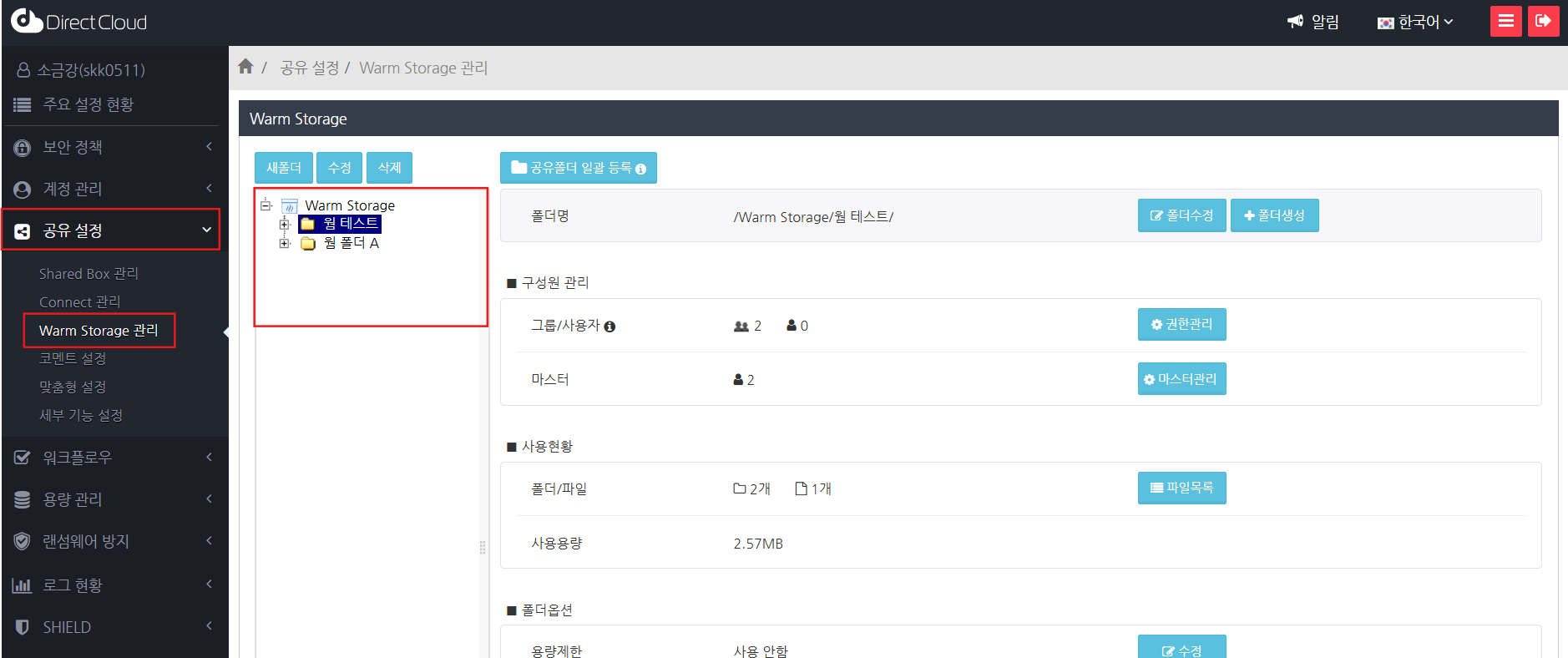 '공유 설정' > 'Warm Storage 관리' 메뉴를 클릭한 후, 폴더 트리에서 제1계층 이후의 폴더를 선택합니다.