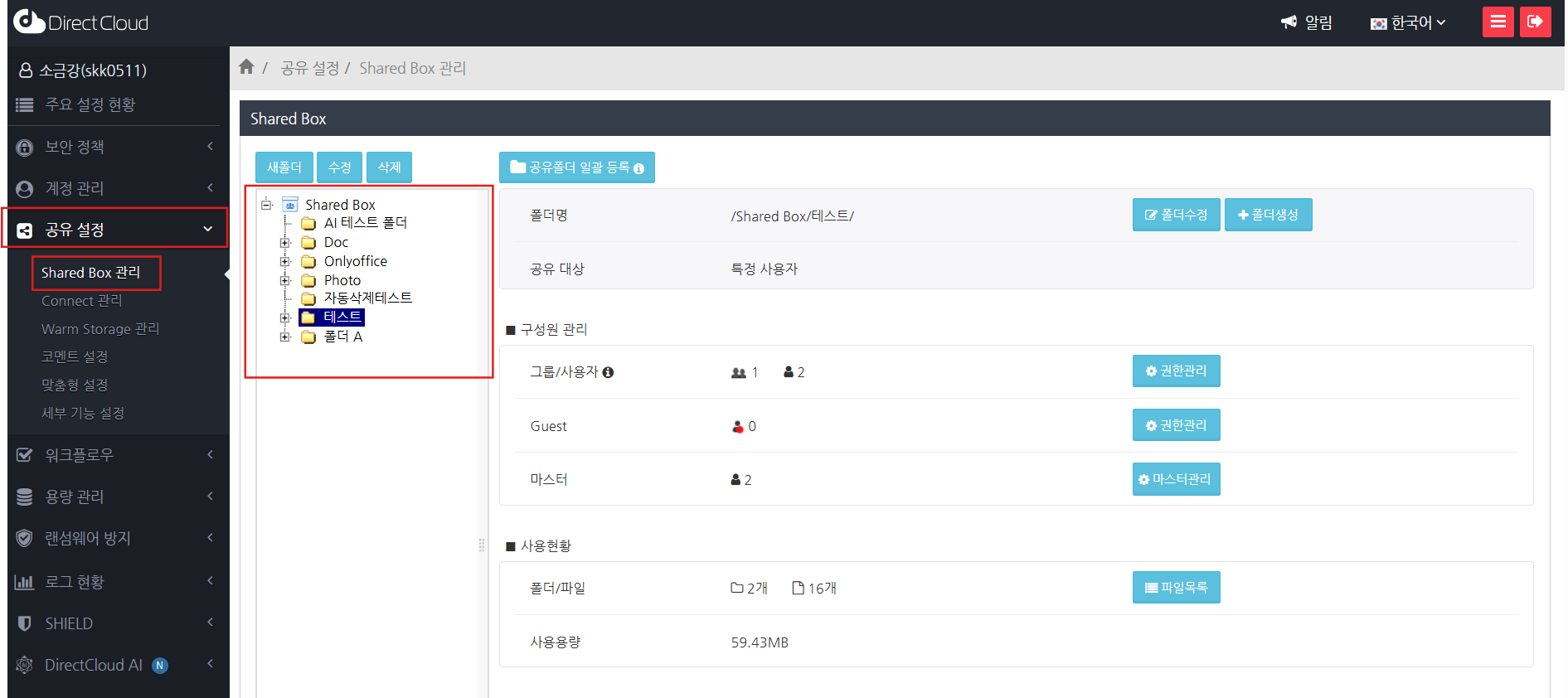 관리자 권한이 부여된 사용자는 관리자 페이지의 '공유 설정'을 사용할 수 있습니다.