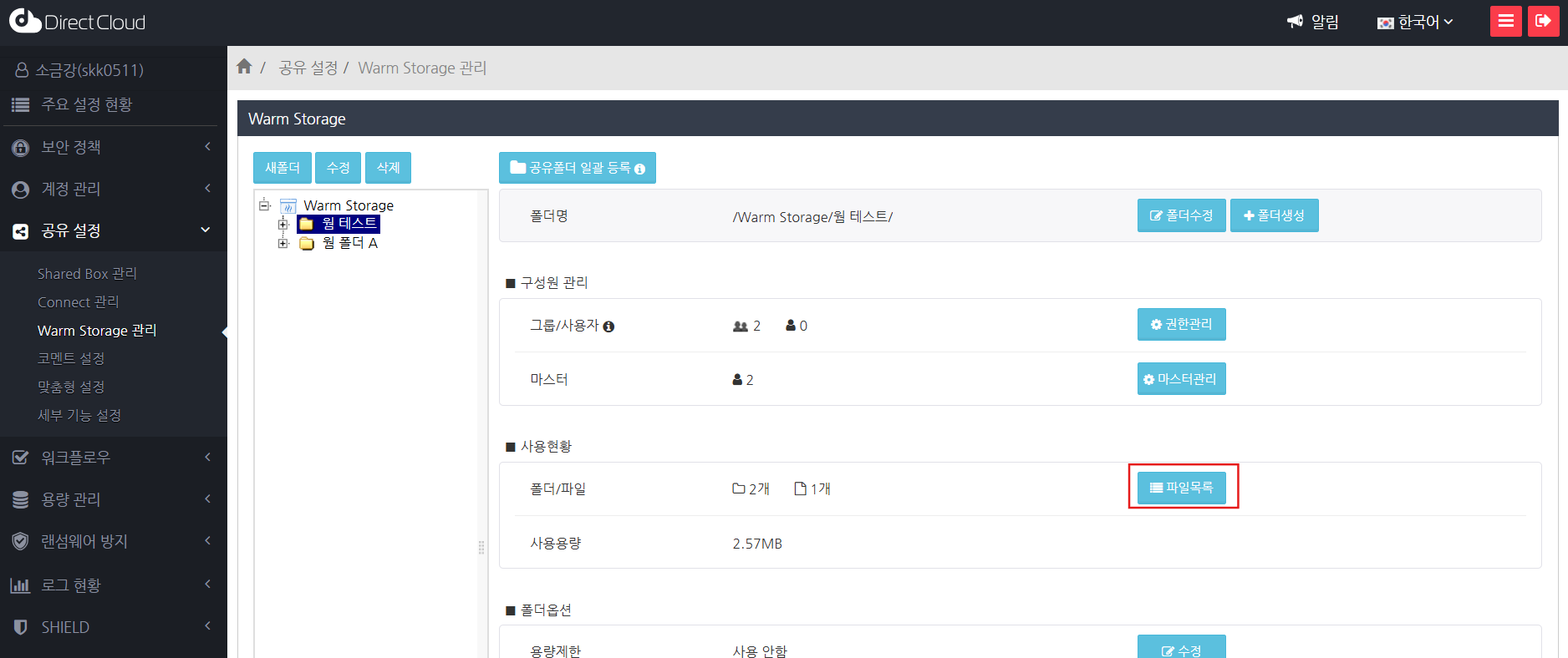 DirectCloud에서는 Shared Box에서 사용하는 Storage(Hot Storage) 외에 Warm Storage를 제공하고 있습니다. 일반적인 Hot Storage에서 링크나 버전 관리 등 일부 기능을 제외한 Warm Storage는 더 저렴하게 이용할 수 있기 때문에, 예를 들어 자주 사용하지 않는 데이터를 장기 보관하는 데 적합합니다. 이 매뉴얼에서는 관리자 페이지에서 Shared Box에서 Warm Storage로 이동된 폴더 및 파일을 목록으로 표시하여 이동된 위치 정보를 확인하는 방법과, Warm Storage에 저장된 폴더 및 파일을 목록으로 표시하여 이동 전 위치 정보를 확인하는 방법을 설명합니다.