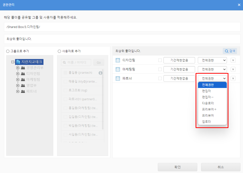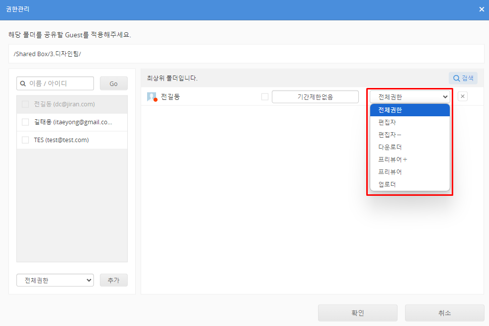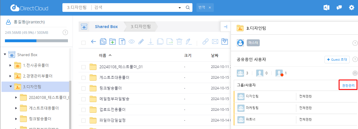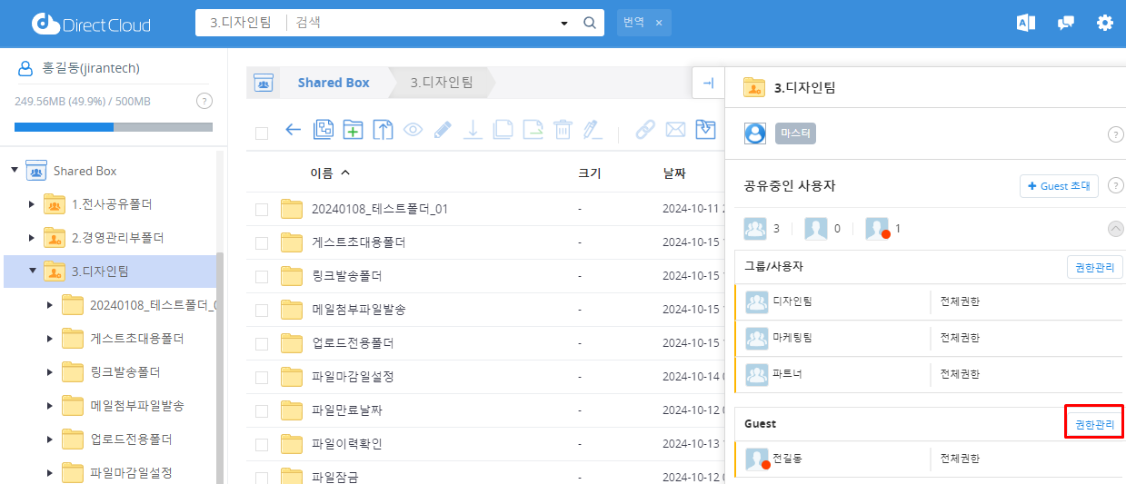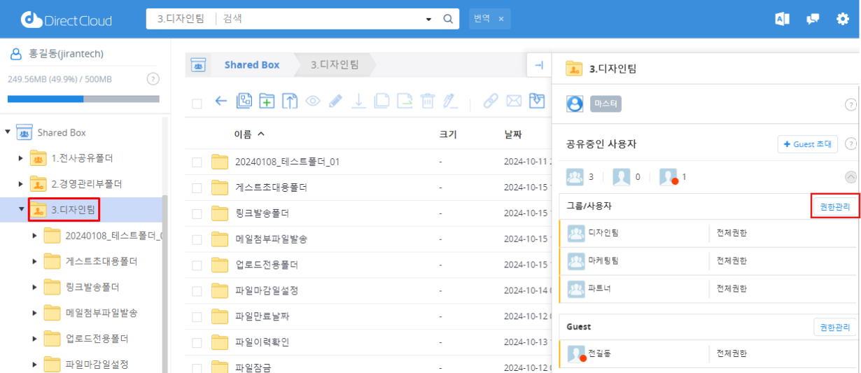 관리자 페이지의 '공유설정'->'Shared Box 관리' 에서 이용할 폴더를 클릭하면 나타나는 우측의 설정항목에서 '권한 관리 확대’를 ‘사용’으로 설정