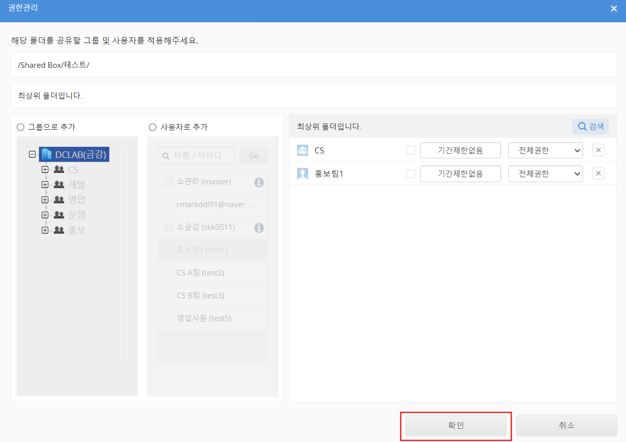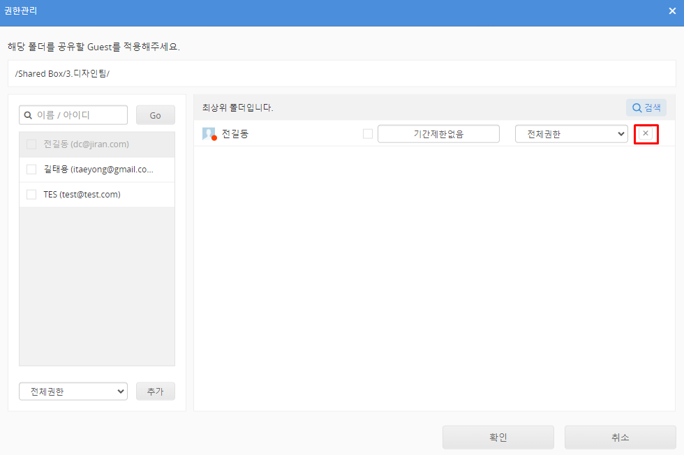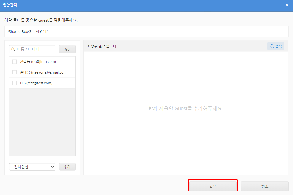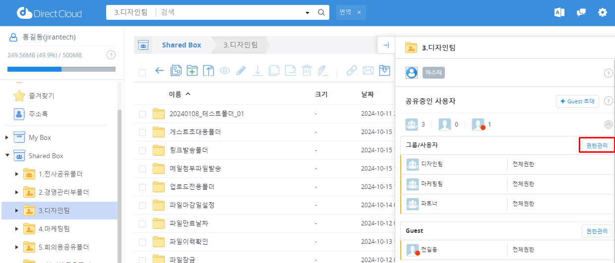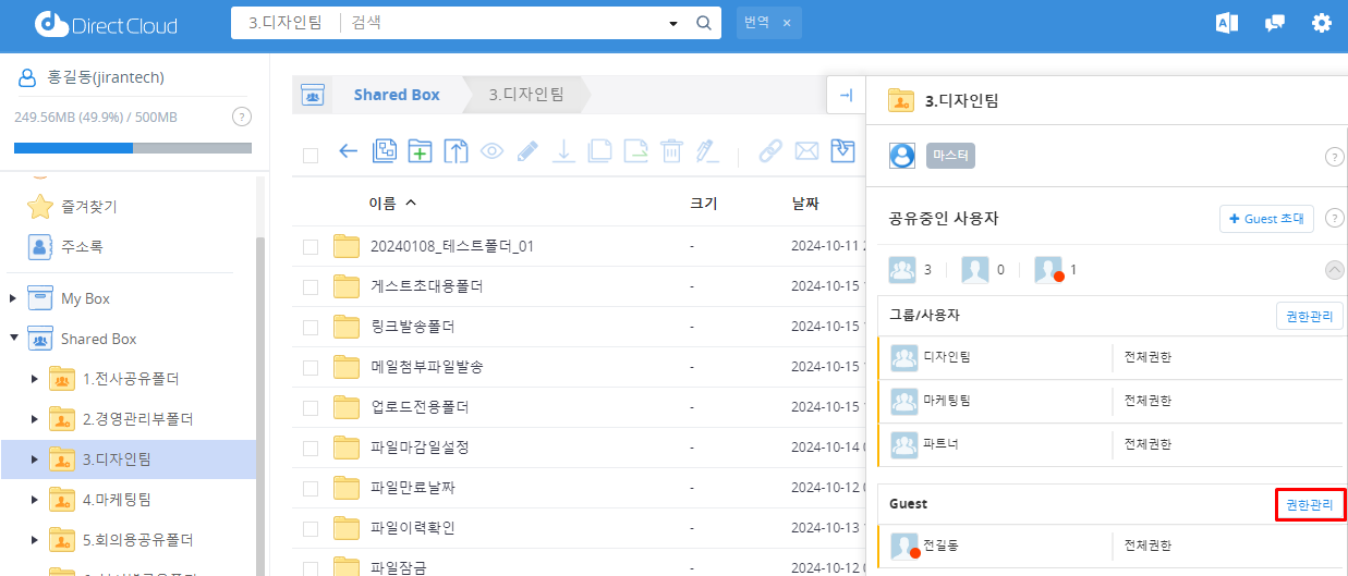 관리자 페이지의 '공유설정'->'Shared Box 관리' 에서 이용할 폴더를 클릭하면 나타나는 우측의 설정항목에서 '권한 관리 확대’를 ‘사용’으로 설정