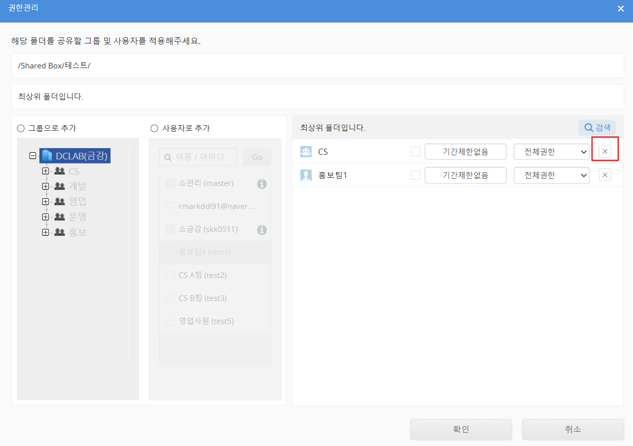 접근 권한을 삭제할 그룹 또는 사용자의 '×' 버튼을 클릭합니다.