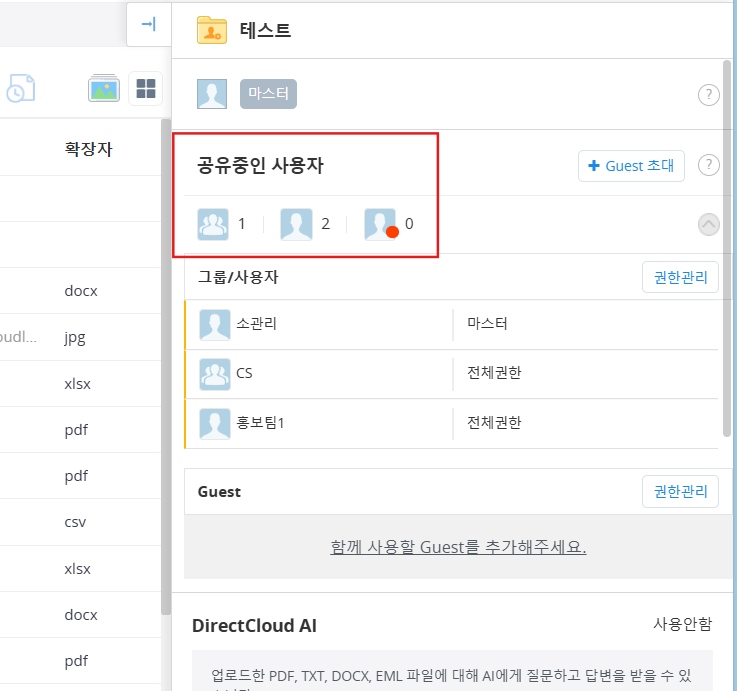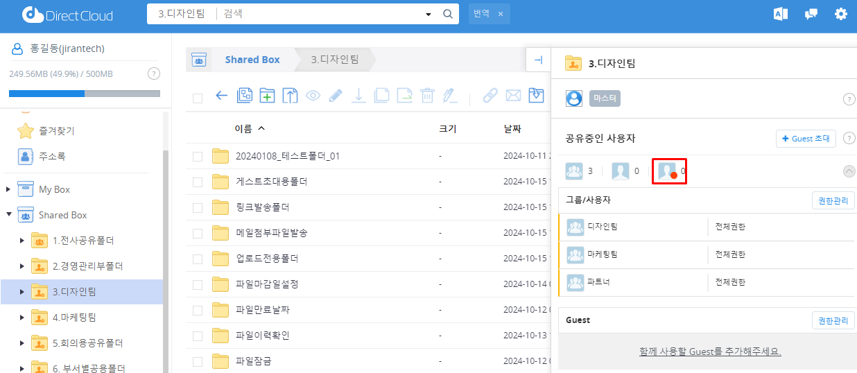 폴더 접근 권한을 가진 사용자의 정보를 사용자 페이지에 표시하는 방식에 따라, ‘관리자 설정에 의해 일부 공유자 정보만 제공될 수 있습니다.’라는 메시지가 나타날 수 있습니다. 이 경우, 사용자가 직접 초대한 Guest라 하더라도 접근 권한 레벨을 변경할 수 없는 경우가 있습니다.