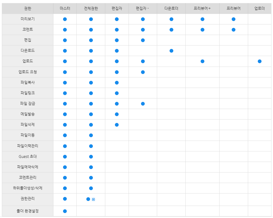 ※ 폴더별 설정에 따라'권한 관리'를 전체권한에게 부여할 수 있습니다. 단, Guest는 전체권한이라도 해당 기능을 사용할 수 없습니다.