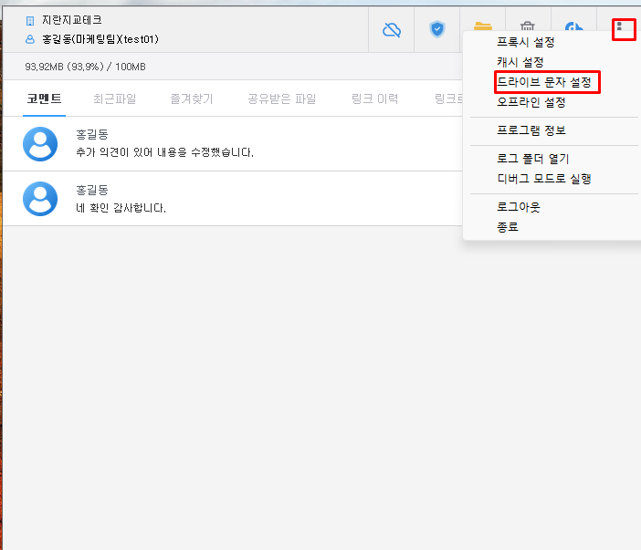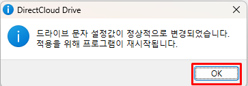 사용자가 DirectCloud Drive에 로그인한 후 관리 페이지에서 폴더 경로의 드라이브 문자 설정이 변경된 경우, 사용자가 애플리케이션을 재시작하면 변경 사항이 반영됩니다.