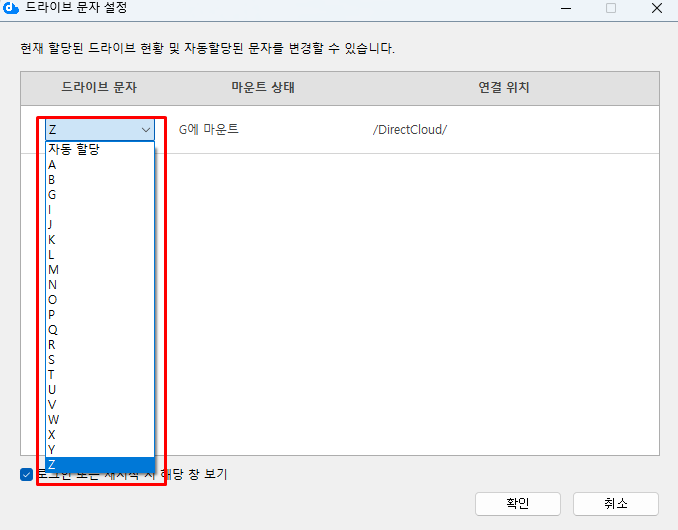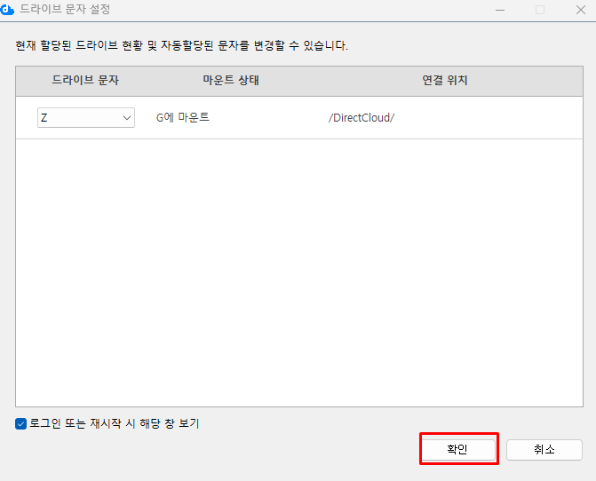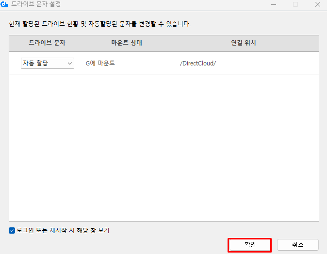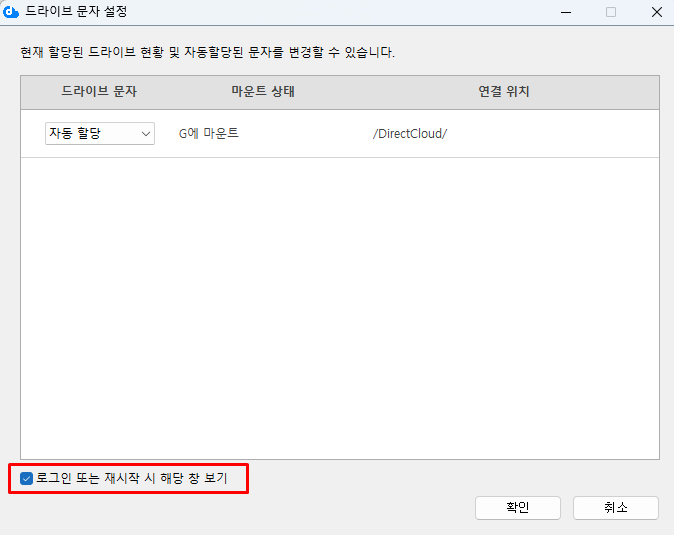 드라이브 문자 할당 설정 화면을 자동으로 표시하도록 하려면, 드라이브 문자 할당 설정 화면에서 “로그인 또는 재시작 시 해당 창 보기'에체크합니다. 다시 자동 표시되지 않도록 설정하려면 체크를 해제하십시오.